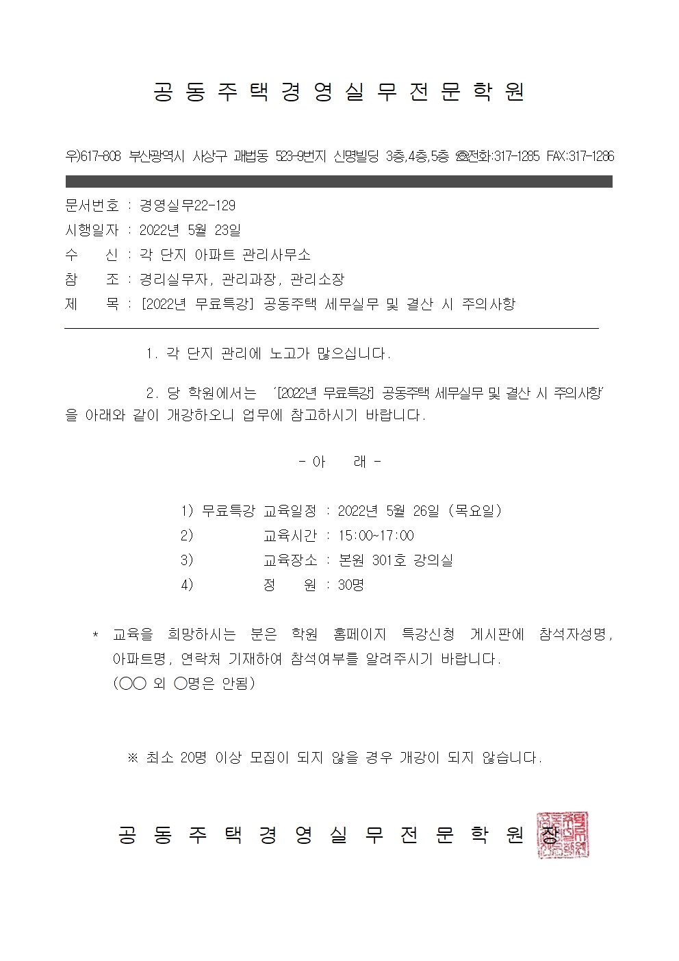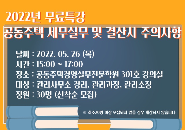 <'[2022년 무료특강] 공동주택 세무실무 및 결산 시 주의사항' 일정을 아래와 같이 안내드립니다.>