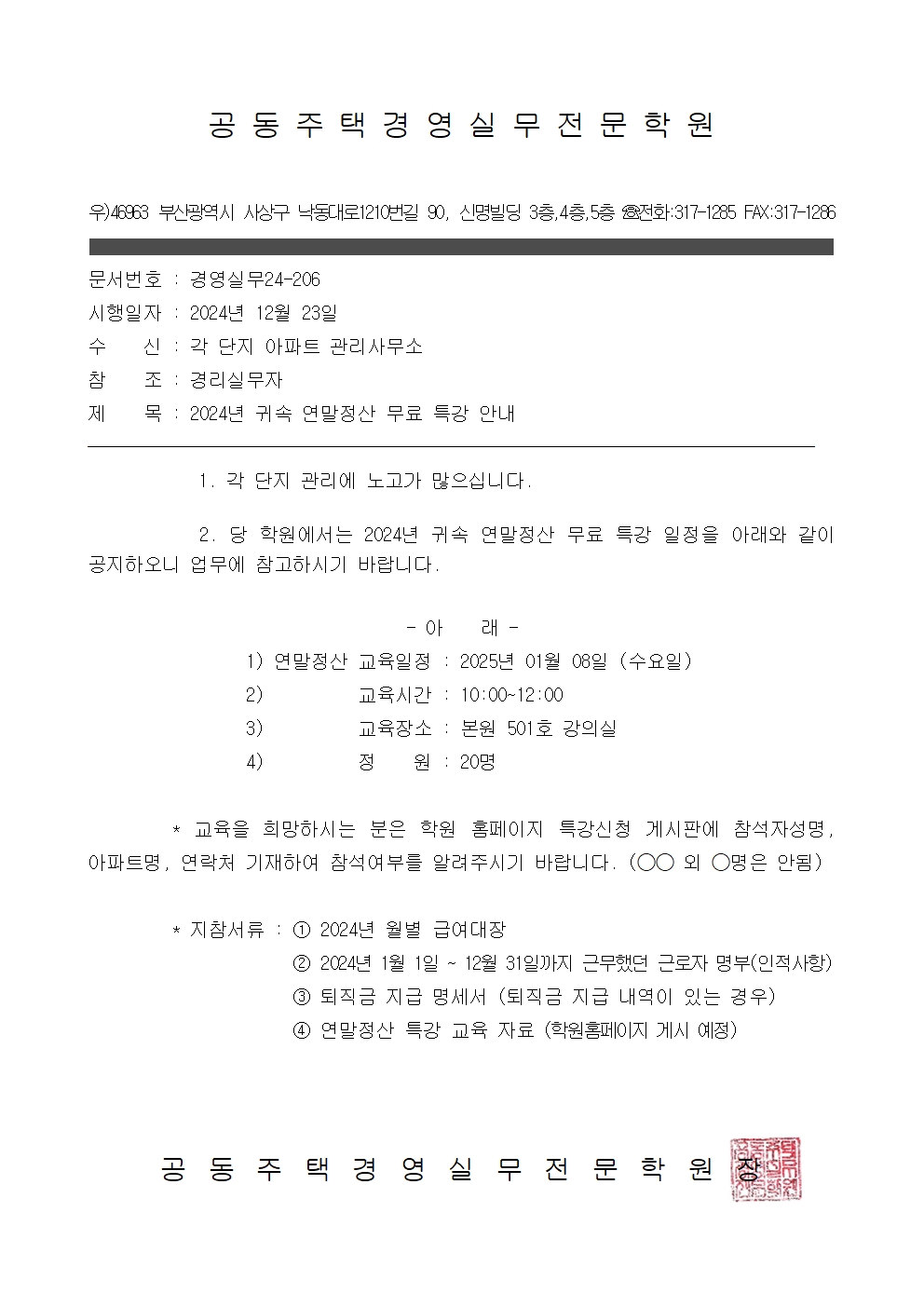 <2024년 귀속 연말정산 특강 일정을 아래와 같이 안내드립니다.>